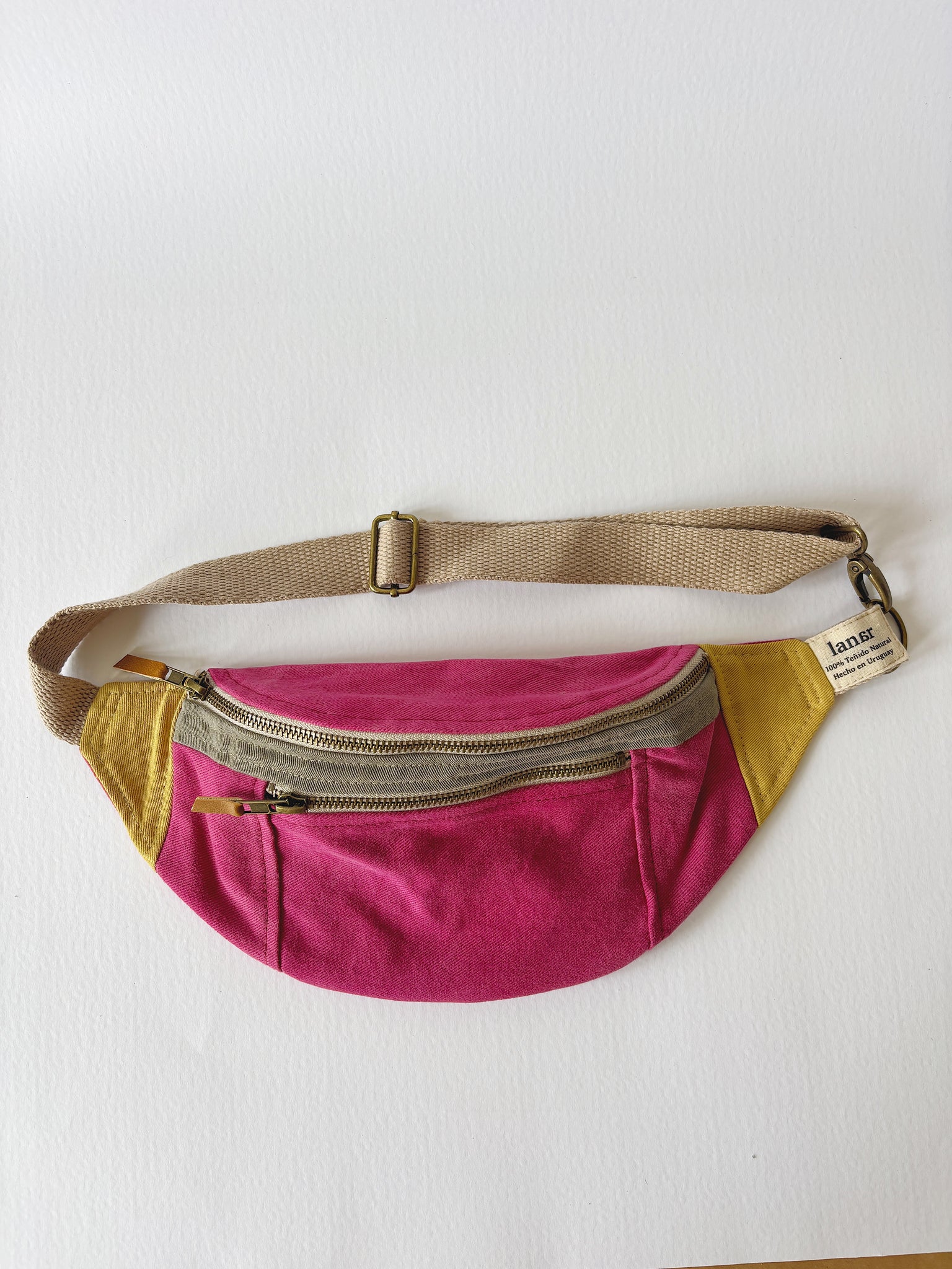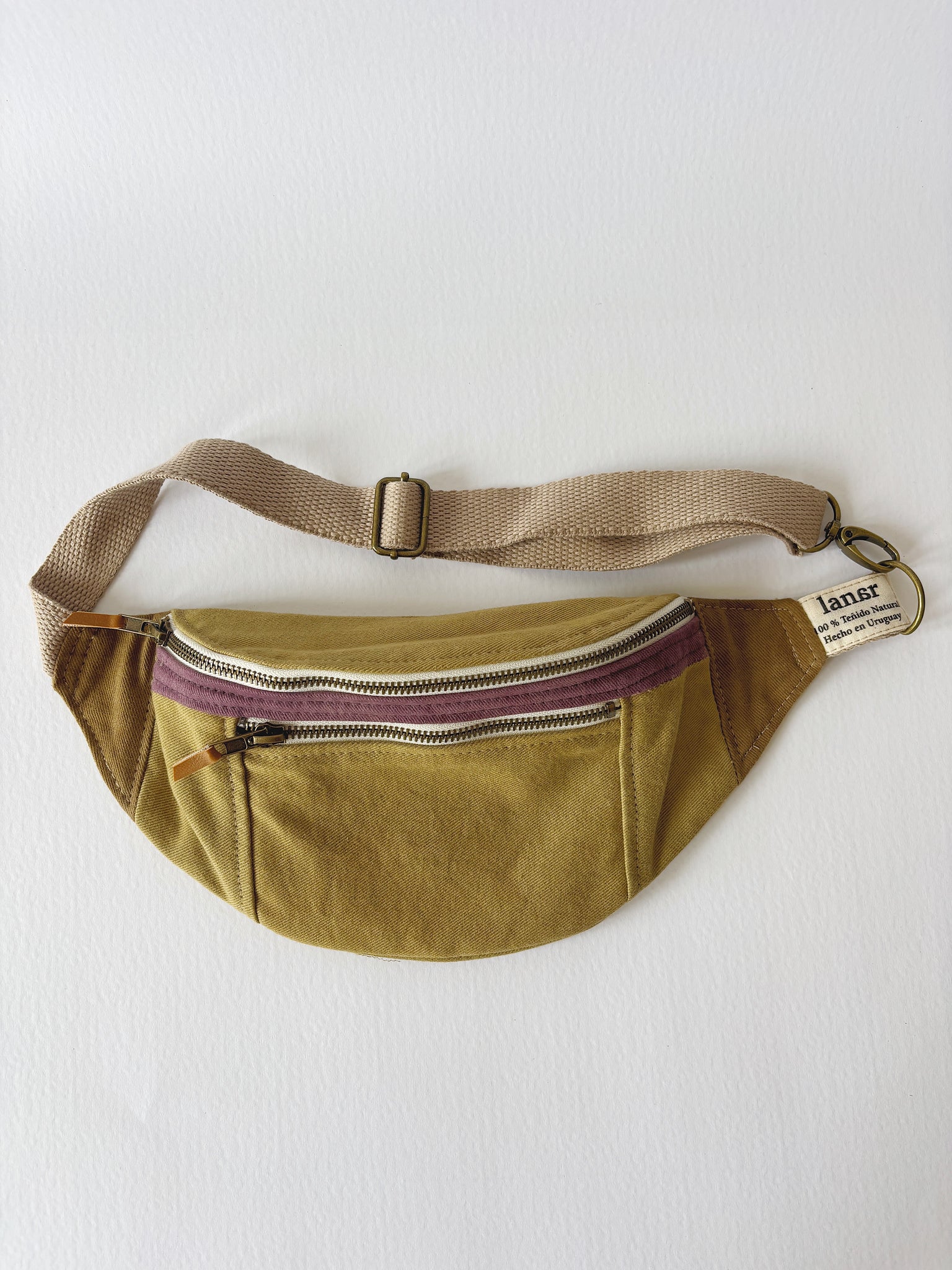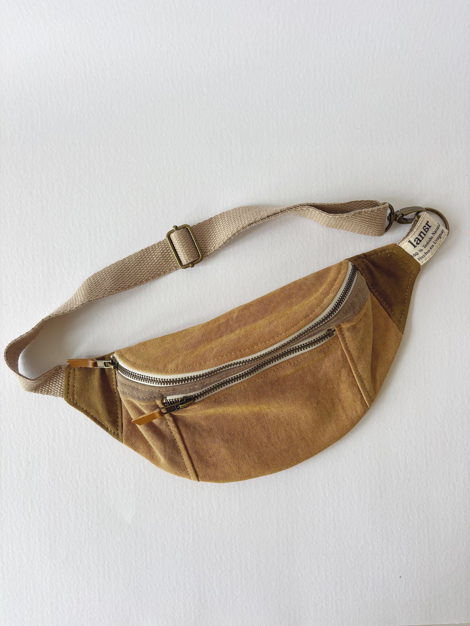 Riñonera lisa con dos bolsillos con cierres de bronce. Correa regulable, se cierra con gancho de bronce.