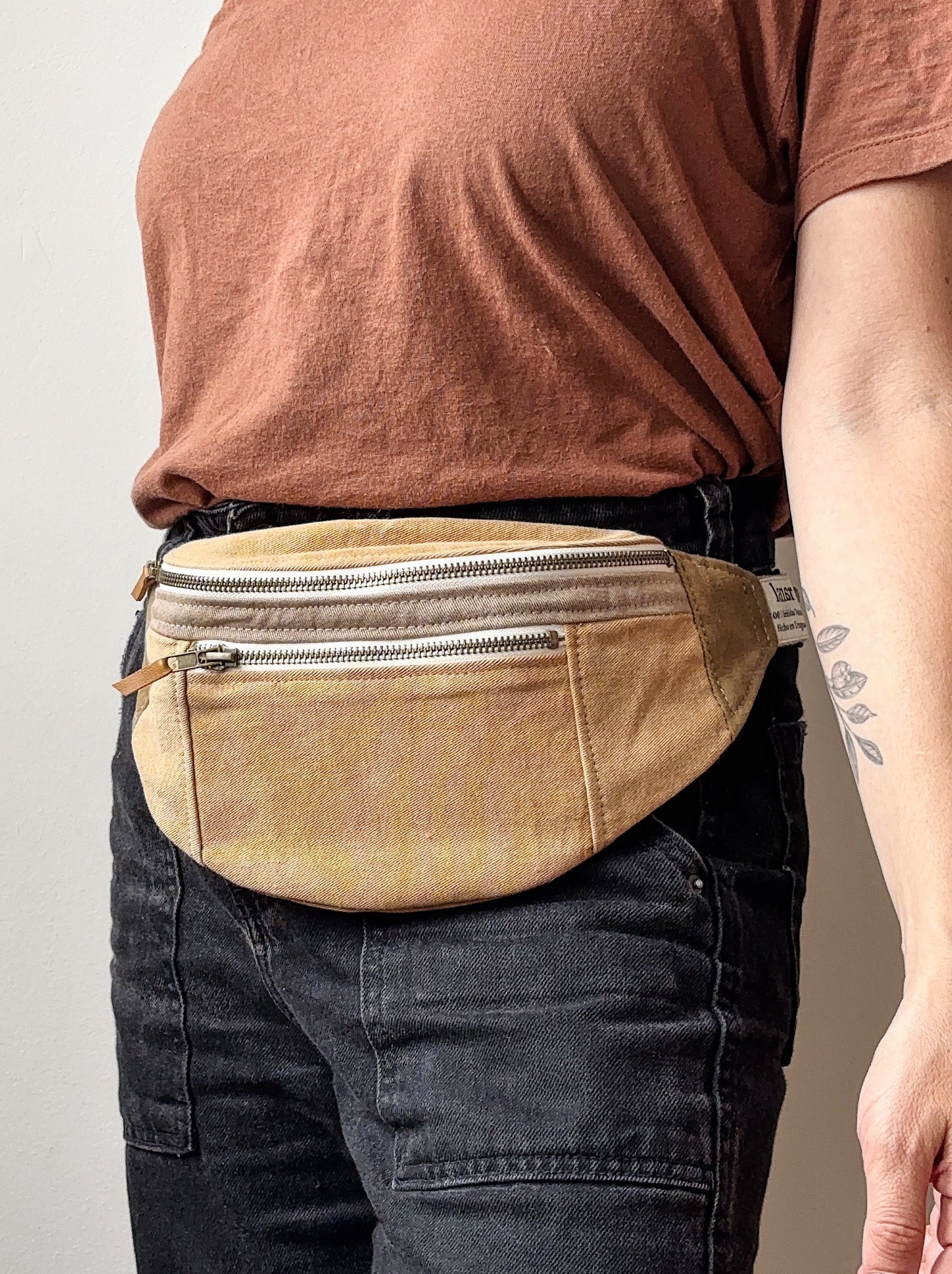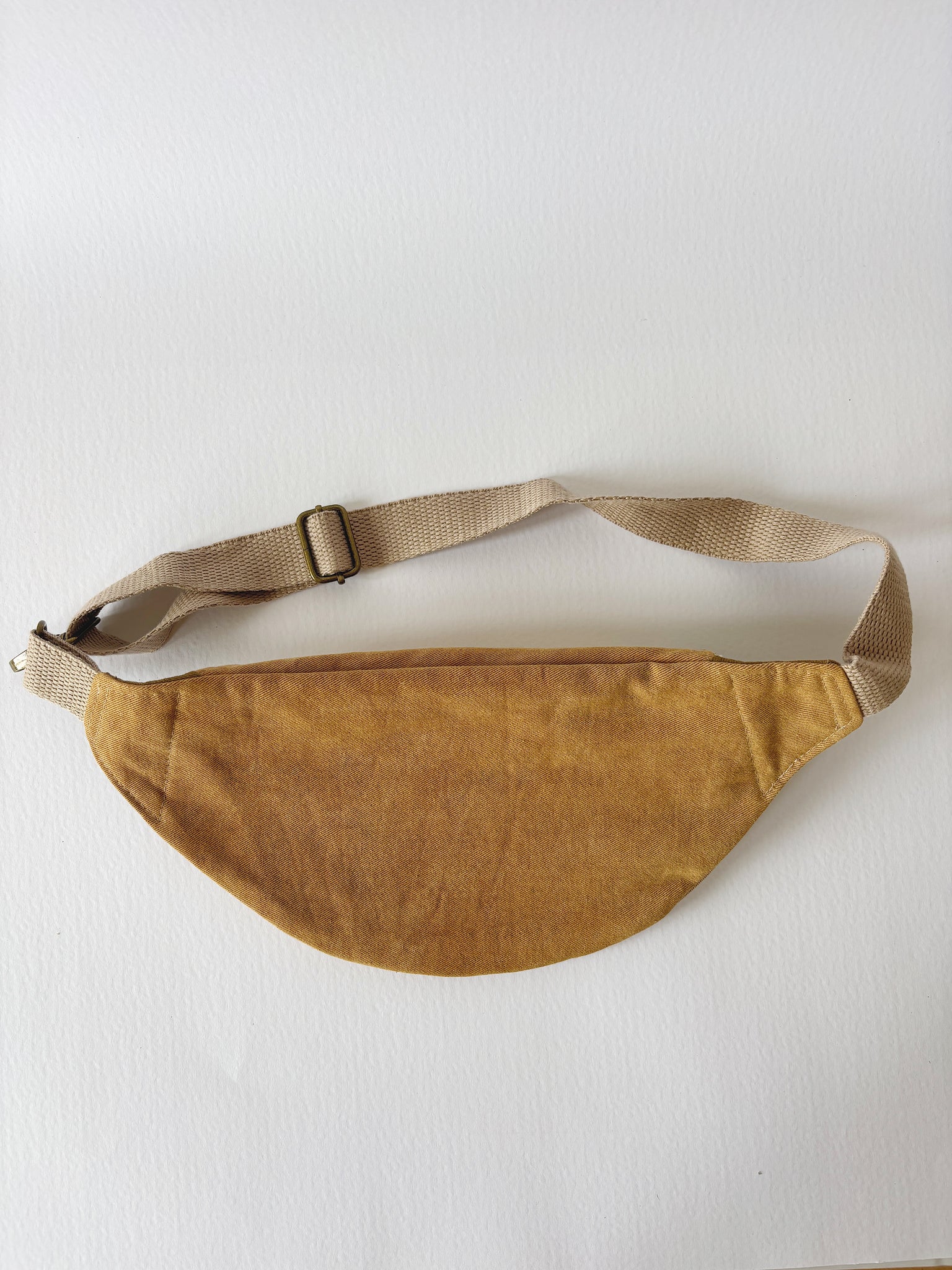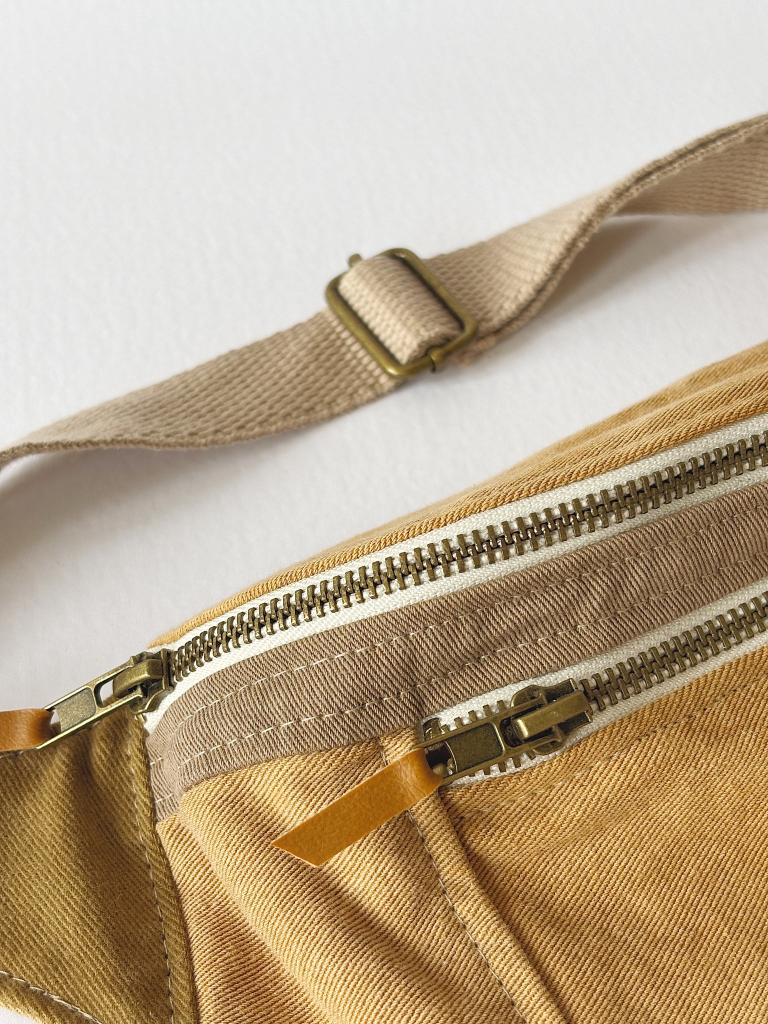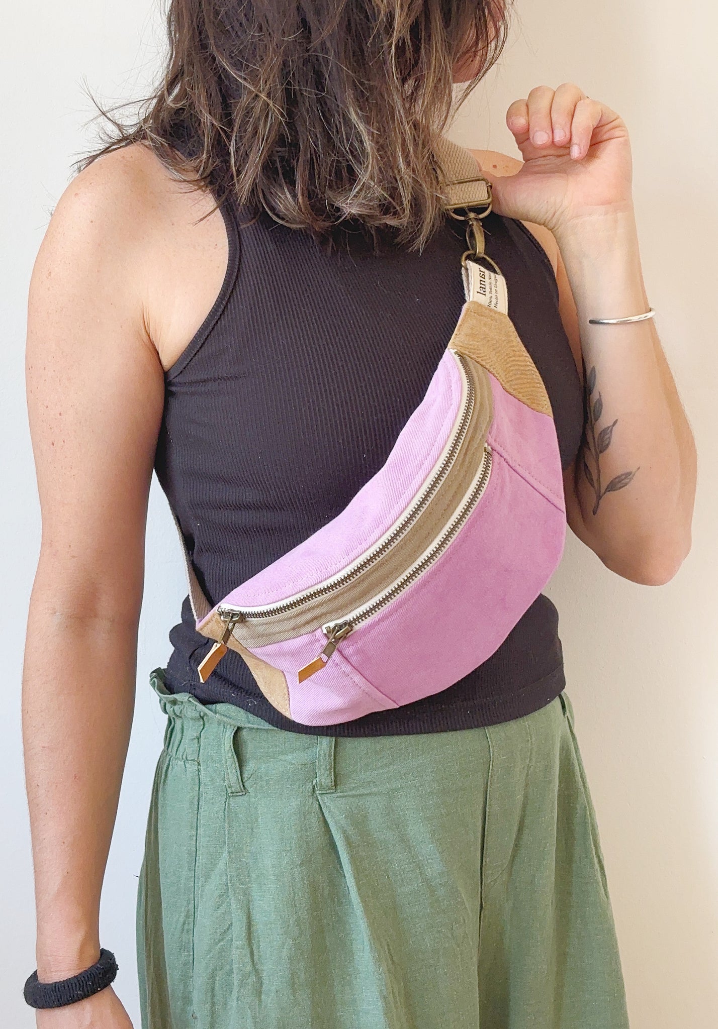 Riñonera lisa con dos bolsillos con cierres de bronce. Correa regulable, se cierra con gancho de bronce.